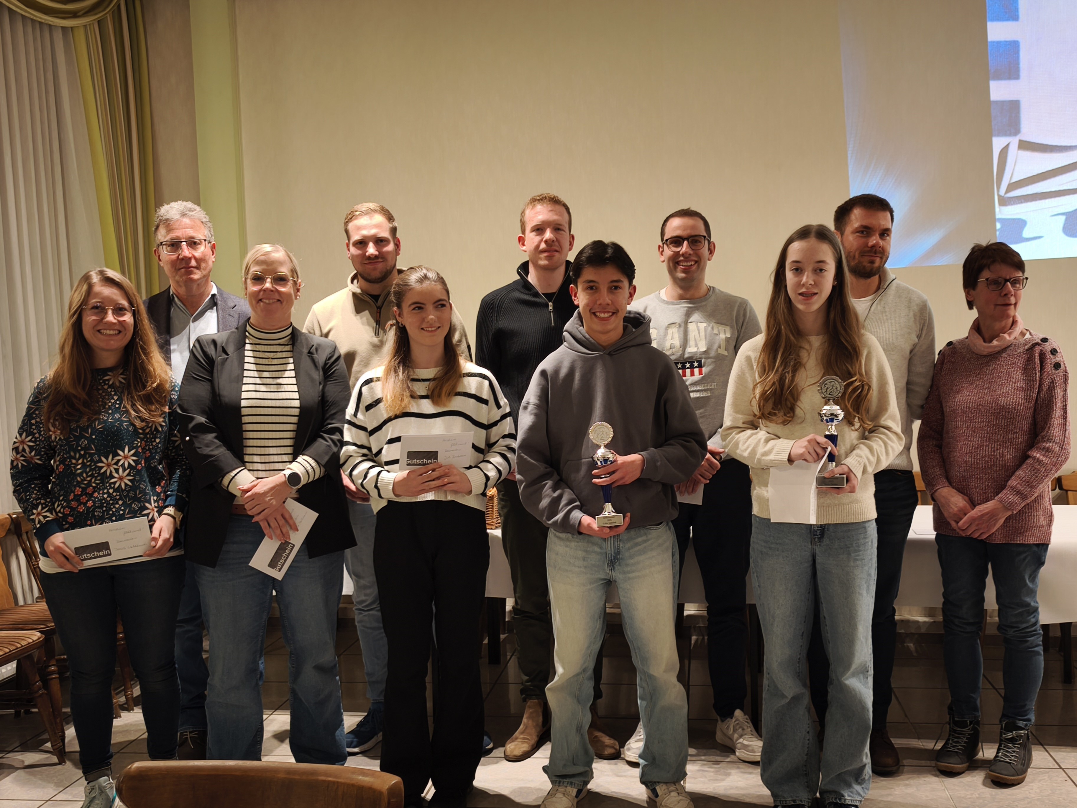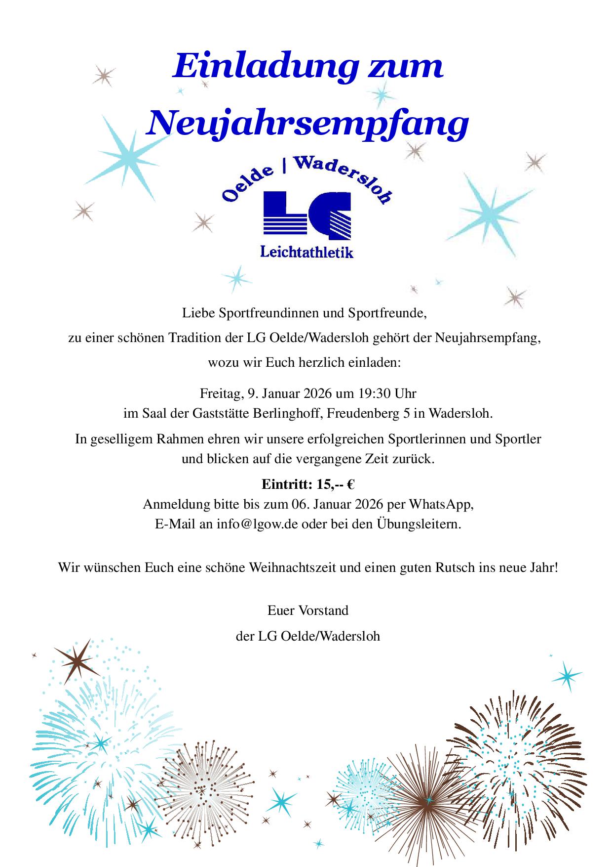 Im Saal der Gaststätte Berlinghoff konnte der LG-Vorsitzende Klemens Waldikowski die Mitglieder der Leichtathletikabteilung des TuS Wadersloh und des TV Jahn Oelde sowie des Lauf- und Walkingtreffs zum Neujahrsempfang der LG Oelde/Wadersloh willkommen heißen. Die jugendlichen und erwachsenen Sportlerinnen und Sportler verbrachten einen kurzweiligen, geselligen Abend mit Rückblicken, unterhaltsamen Beiträgen und Ehrungen. Insgesamt 24 Kreismeisterinnen und -meister stellte die LG im Jahr 2025, wovon elf aus dem Jugend- und Erwachsenenbereich an diesem Abend geehrt wurden. Thomas Wehner erzielte einen Westfalenmeistertitel im Kugelstoß der Senioren M55. Zehn weitere Athletinnen und Athleten gingen im Laufe des Jahres mit guten Leistungen und Platzierungen auf westfälischer Ebene an den Start.
