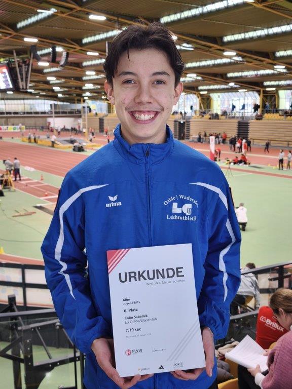 Am 25. Januar startete Colin Sabellek bei den Westfälischen Hallenmeisterschaften I in Dortmund. Die Helmut-Körnig-Halle bietet in allen Disziplinen optimale Voraussetzungen für gute Leistungen und persönliche Erfolge. Insgesamt dreißig Athleten der M15 waren vom FLVW zum 60-Meter-Sprint zugelassen worden. Colin startete mit seiner Meldezeit von 7,92 Sekunden im zweiten von vier Vorläufen. Hochmotiviert und mit dem Ziel das Finale zu erreichen, beendete er seinen Lauf als Zweiter. Mit seiner neuen Bestzeit von 7,84 Sekunden qualifizierte sich Colin für das Finale. Als Siebtschnellster der Vorläufe war die Motivation im Endlauf noch einmal groß, einen Urkundenplatz zu erreichen. Am Ende stand eine erneute Verbesserung auf 7,79 Sekunden und ein toller sechster Platz auf der Anzeigentafel und später auch auf seiner Urkunde.
