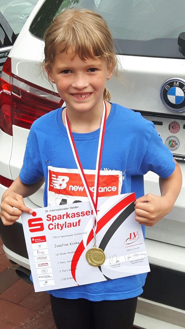 Bei tollem Laufwetter starteten zahlreiche LG-Aktive am 10. Juni 2017 beim 20. Oelder Sparkassen Citylauf. Die siebenjährige Josefine Klinke freute sich über ihren ersten Platz beim 750-Meter-Lauf durch die Innenstadt.