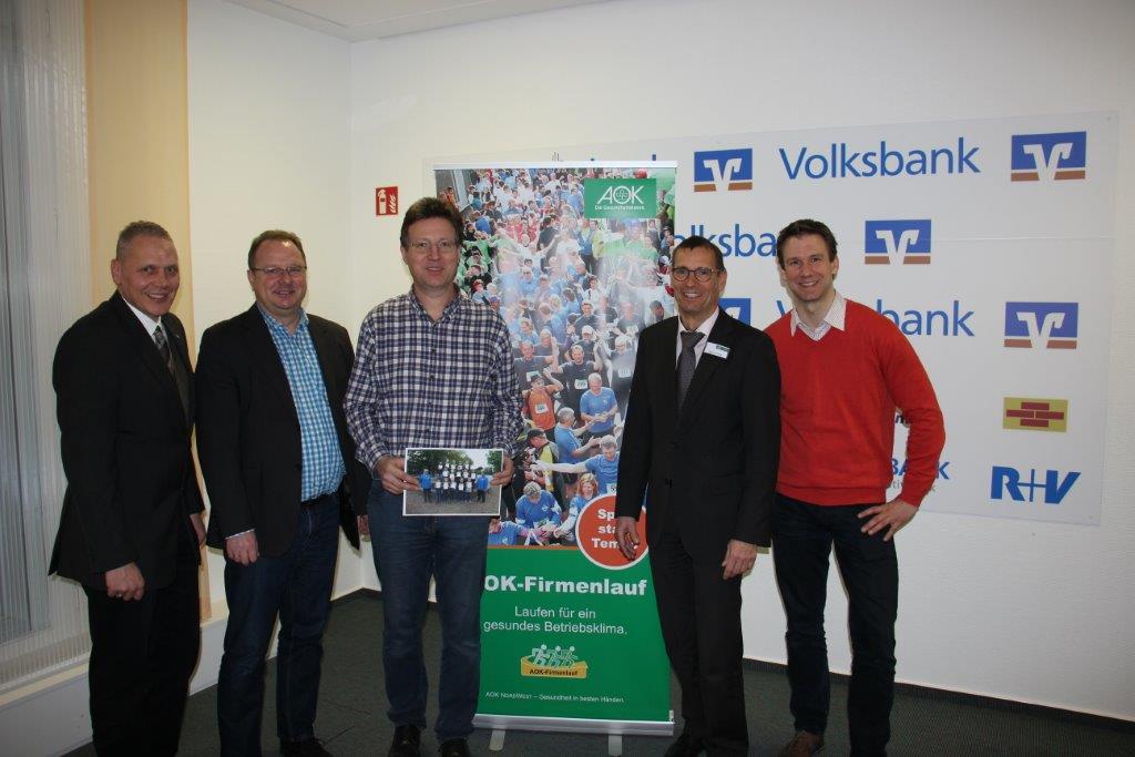 Kürzlich trafen sich Ulrich Lier (Volksbank eG), Helmut Jügenschellert (Stadt Oelde), Klemens Waldikowski (LG Oelde/Wadersloh), Wolfgang Peschke und Frank Papesch (beide AOK Nordwest) zum Planungsauftakt des 8. AOK-Firmenlaufs. Dieser findet am 28. April 2017 im Rahmen des 16. Oelder Frühlingslaufs statt. Die gemeinsame Veranstaltung von AOK Nordwest und der Leichtathletikabteilung des TV Jahn Oelde lädt auch in diesem Jahr Sportlerinnen und Sportler aller Altersgruppen in die Oelder Innenstadt ein.