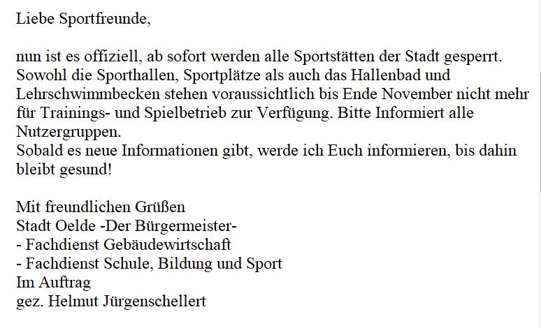 nach einer Ankündigung der Stadt Oelde muss der Trainingsbetrieb in Oelde ab sofort eingestellt werden, da die Sportstätten ab dem heutigen Donnerstag coronabedingt geschlossen sind.