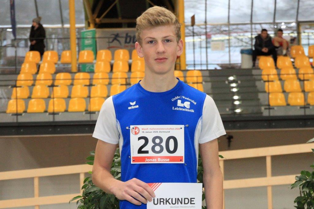 Unter diesen optimalen Bedingungen startete Jonas Busse (M16) erstmalig unter Wettkampfbedingungen über die 400-Meter-Distanz. In dieser Disziplin waren lediglich zwei Athleten am Start. In einem taktischen Rennen ging sein vorab bereits als stärker eingeschätzter Konkurrent in Führung und ließ nichts anbrennen. Jonas beendete die zwei Hallenrunden auf der nagelneuen Tartanbahn nach guten 58,40 Sekunden als Vize-Westfalenmeister der männlichen Jugend U18.