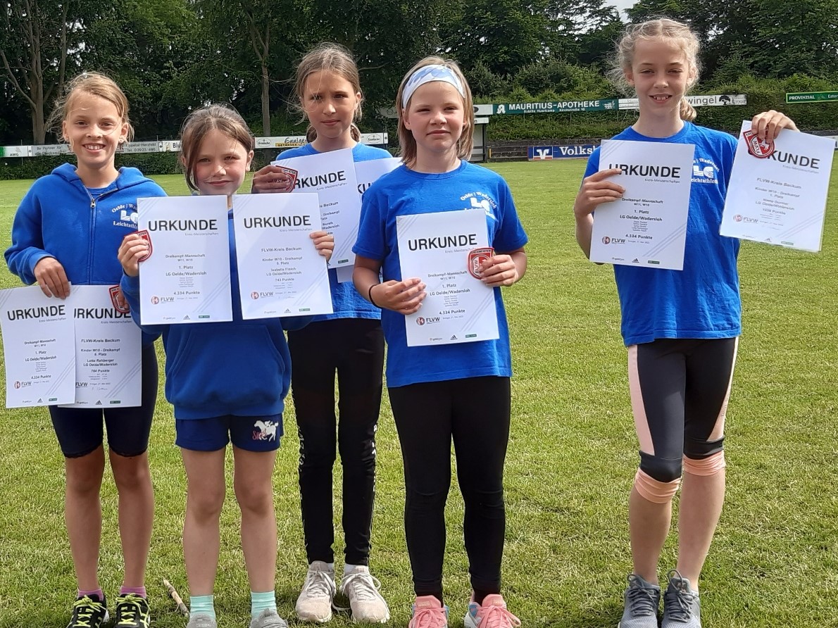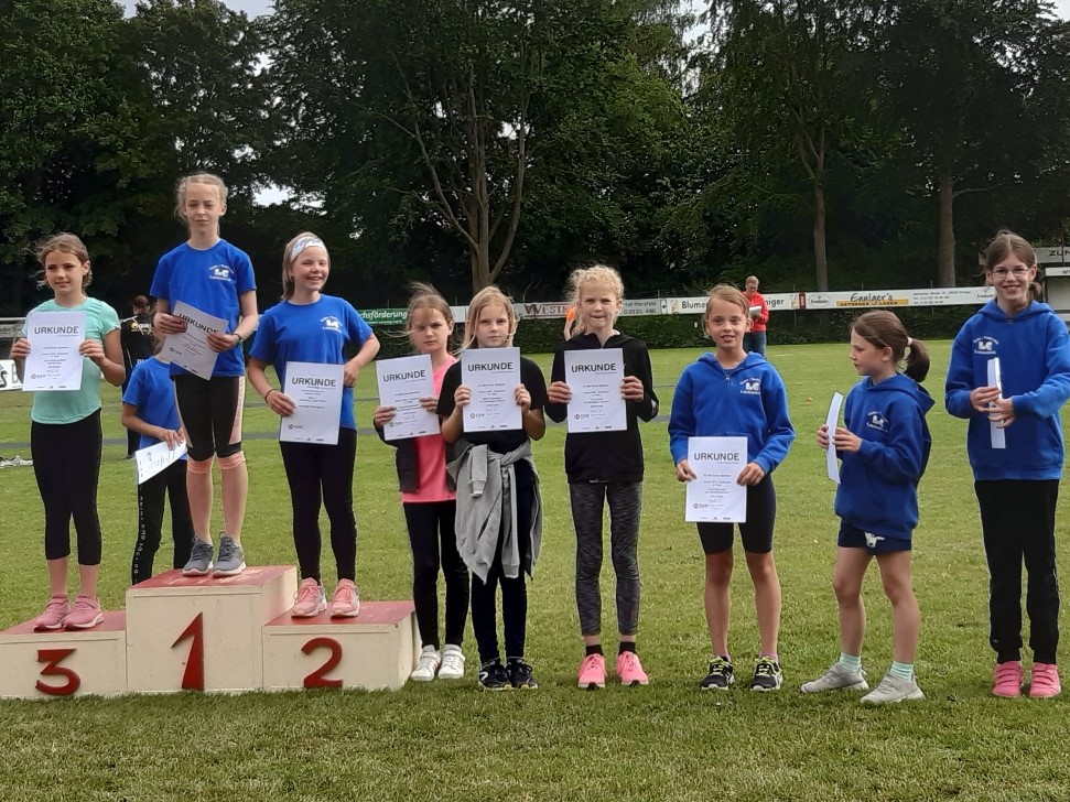 21 junge Athletinnen und Athleten nahmen am 21. Mai erfolgreich an der Mehrkampf-Kreismeisterschaft in Enniger teil. An einem gelungenen Wettkampftag wurden viele tolle Leistungen erzielt. Neele Dunker und Maximilian Fibich wurden Kreismeister im Drei- bzw. Vierkampf in ihren Altersklassen. Zudem stand die Mannschaft der Kinder W11 / W10 als Erstplatzierte auf dem Siegerpodest. Hier freuten sich Neele Dunker, Smilla Sembol, Sanya Bureik, Lotta Rehberger und Isabella Fibich über ihren Kreismeistertitel. Die Vizemeisterschaft erzielte die Mannschaft der Kinder W9 / W8 mit Ina Potthast, Selina Bulgaev, Fiona Debelts, Hannah Nischk und Malena Vasquez-Adolf.