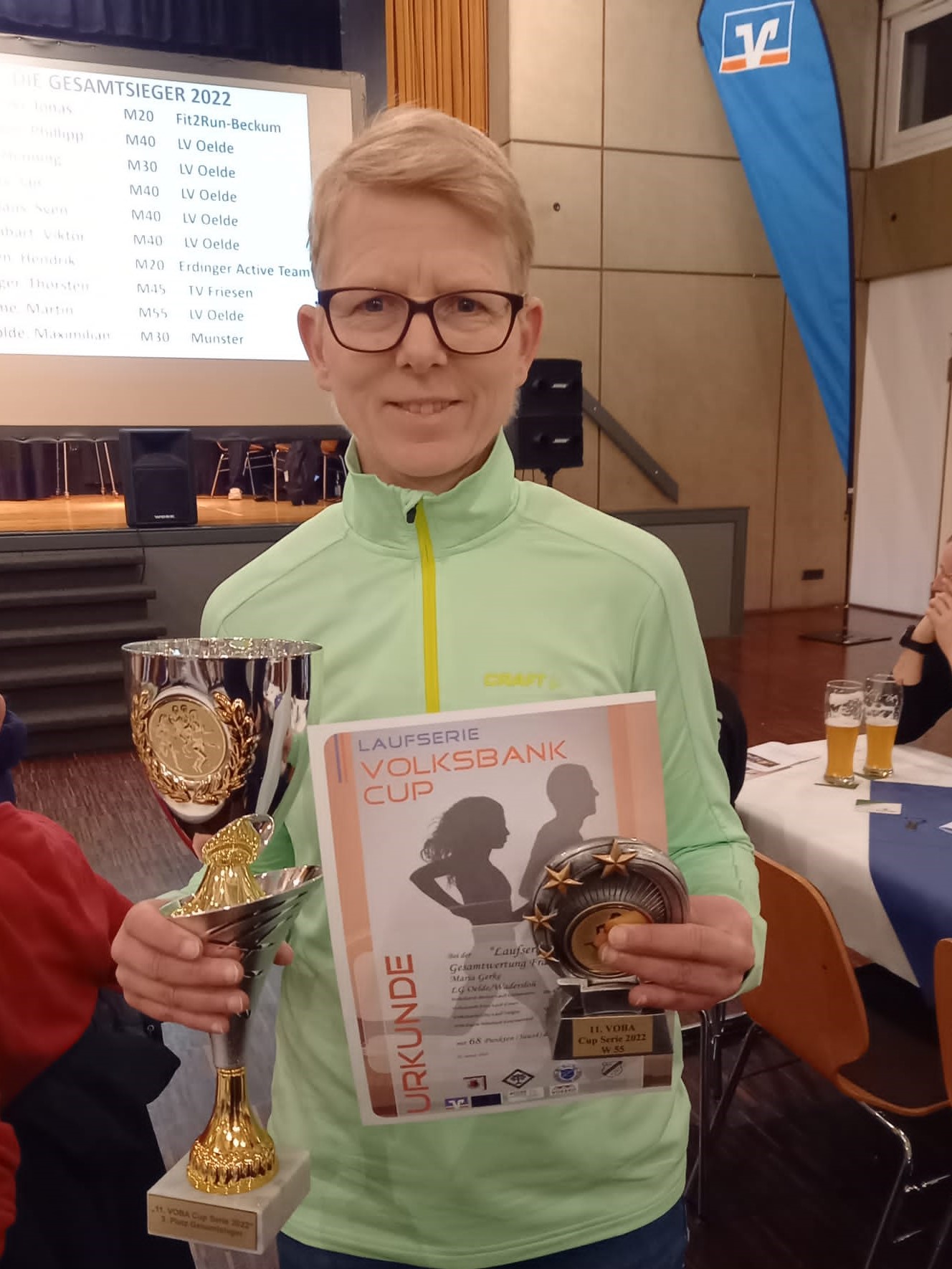 Nach drei Jahren Corona bedingter Unterbrechung konnte kürzlich die Abschlussfeier der Volksbank Cup Laufserie 2022 stattfinden. Zur Siegerehrung mit Rahmenprogramm begrüßte das Organisationsteam der beliebten Laufserie die Teilnehmenden in der Everswinkeler Festhalle. Laut Aussage von Moderator Mirco Borgmann seien die Anwesenden Allwetterläufer, hätten bei 32 Grad die Hitzeschlacht von Ostbevern gemeistert, den sandigen Boden in Einen bezwungen, dem Regen in Telgte sowie der Eiseskälte in Everswinkel getrotzt. 99 der mehr als 110 Teilnehmenden hatten sich für die Veranstaltung qualifiziert, indem sie im vergangenen Jahr mindestens drei der vier Läufe in Ostbevern, Einen, Telgte und Everswinkel absolviert hatten. Aus diesem Anlass wurden jetzt die verdienten Pokale und Urkunden überreicht.