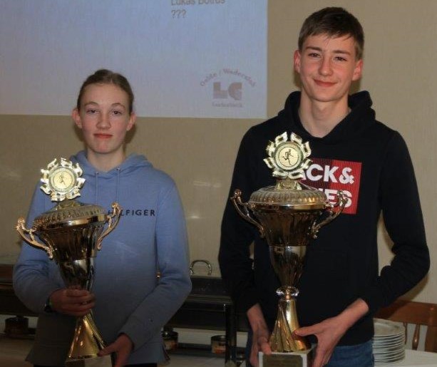 Mit Tim Westermann und Marit Nordhoff wurde in diesem Jahr zwei jungen Talenten die LG-Krone verliehen. Maria Gerke freute sich als Trainerin besonders: „Tim und Marit sind beide seit der ersten Klasse bei den Leichtathleten des TuS Wadersloh. Sie sind zuverlässig und kommen regelmäßig zum Training.“ Das zahlt sich aus. Beide absolvieren jährlich das Sport- und Mehrkampfabzeichen, besuchen regelmäßig Wettkämpfe in der Umgebung und haben mehrmals an Kreismeisterschaften in der Halle und während der Freiluftsaison teilgenommen. Ihre Lieblingsdisziplin ist der Sprint und auch in der Staffel laufen sie gerne. Tim entwickelt sich immer mehr zum talentierten Hochspringer. Sein Potenzial stellte er erst kürzlich beim U14-Vergleichskampf der Kreise des Münsterlandes unter Beweis, wo er seine eigene Bestleistung deutlich verbesserte und zwölf Zentimeter höher sprang als der Zweitplatzierte. Auch im Kugelstoß erreicht er beachtliche Weiten. Marit mag besonders den Weitsprung, ist aber auch auf der Mittelstrecke zuhause. Verlässlichkeit und Teamgeist bewies sie jüngst beim Kreis-Vergleichskampf. Obwohl sie lieber in einer anderen Disziplin an den Start gegangen wäre, ließ sie sich für den 800-Meter-Lauf einteilen, da hier der zweite Startplatz nicht anders besetzt werden konnte und wertvolle Punkte für die Mannschaft verloren gegangen wären.