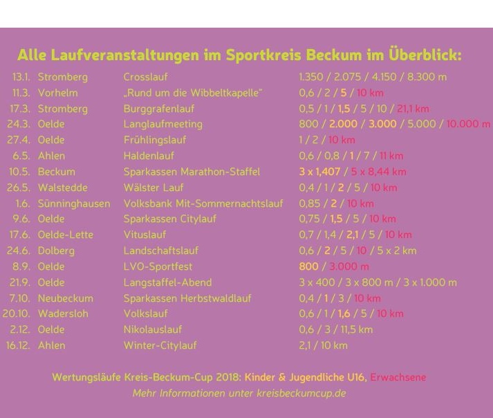 Am 24. März 2018 eröffneten die Leichtathleten die Bahnsaison im Oelder Jahnstadion. Die Leichtathletikabteilung des TV Jahn begrüßte knapp einhundert Läuferinnen und Läufer zum 22. Langlauf-Meeting. Die Wettbewerbe begannen mit dem 800-Meter-Lauf der männlichen und weiblichen Kinder U10. Mit 3:07,4 Minuten gewann Filip Wolanin vom SuS Oberaden den Lauf vor Jorrit Bücker und Tom Döinghaus von der LG Oelde/Wadersloh. Greta Hülsmann lief nach 3:13,0 Minuten als erste Schülerin ins Ziel. Auf den Plätzen zwei und drei folgten ihre Vereinskameradin Franka Wessel und Cora Dierkes vom LV Oelde. Beim 800-Meter-Lauf der weiblichen und männlichen Kinder U12 war Nele Wippich vom LV Oelde in 2:50,1 Minuten, gefolgt von Alina Hofmann (LVO) und Emelie Schulze Westerath (LG Oelde/Wadersloh) am schnellsten unterwegs. Aus den Reihen der LG Ems Warendorf kamen die drei erstplatzierten Schüler dieses Laufes ins Ziel. Timo Völker benötigte 3:04,1 Minuten, für Aaron Ketteler und Niklas Everwin wurden 3:11,6 bzw. 3:14,3 Minuten gestoppt.
