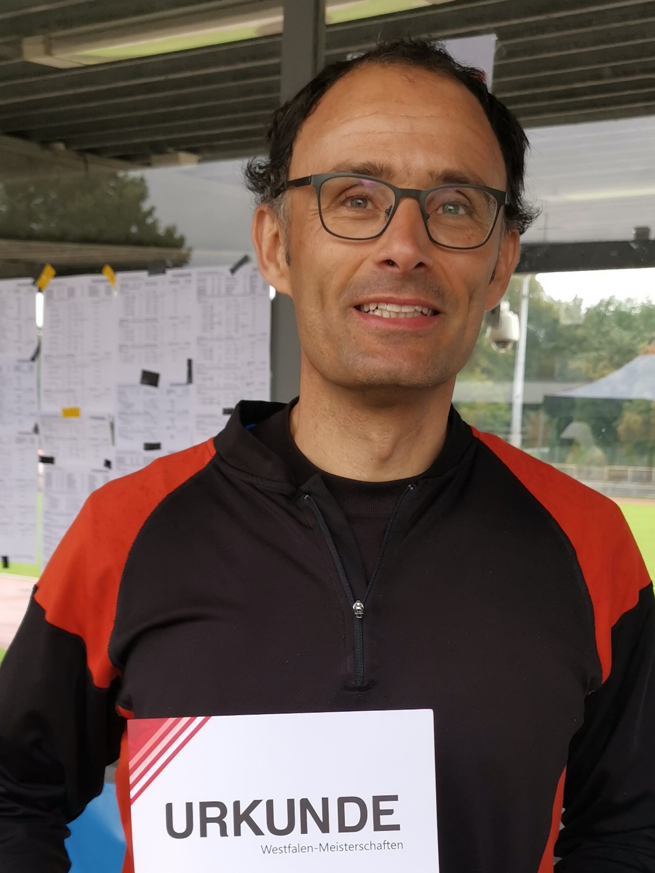 Aufgrund von Corona waren die Startfelder allgemein etwas kleiner als sonst. So war er überraschend der einzige Teilnehmer seiner Altersklasse M50. Da ihm aus diesem Grund der Westfalenmeistertitel bereits mit dem ersten gültigen Versuch sicher war, ging es ihm vornehmlich darum, eine gute Weite zu erzielen.
