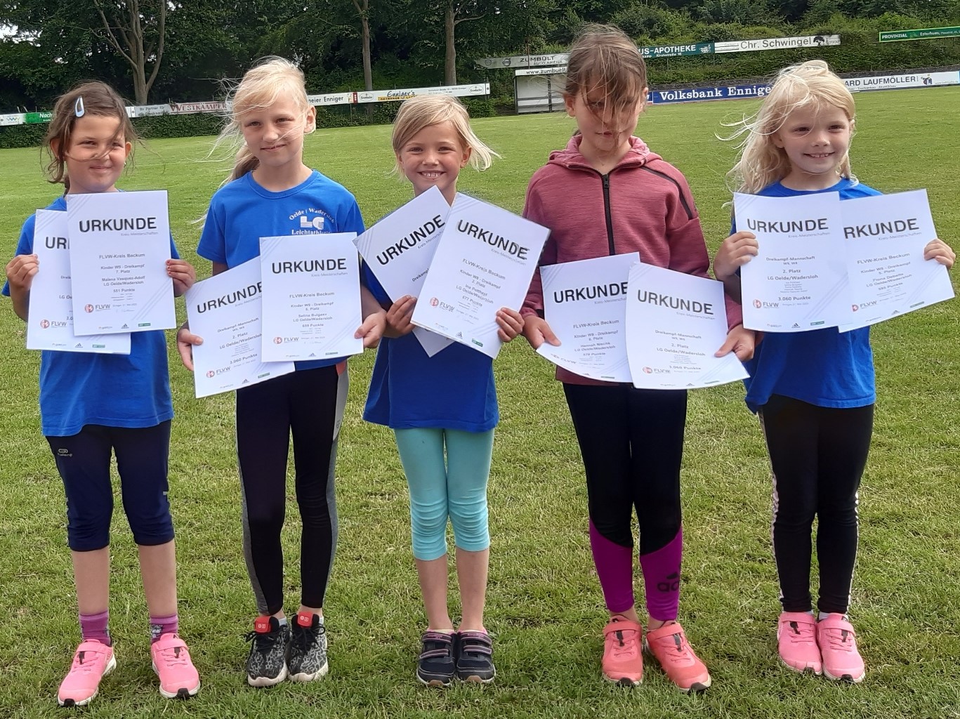 21 junge Athletinnen und Athleten nahmen am 21. Mai erfolgreich an der Mehrkampf-Kreismeisterschaft in Enniger teil. An einem gelungenen Wettkampftag wurden viele tolle Leistungen erzielt. Neele Dunker und Maximilian Fibich wurden Kreismeister im Drei- bzw. Vierkampf in ihren Altersklassen. Zudem stand die Mannschaft der Kinder W11 / W10 als Erstplatzierte auf dem Siegerpodest. Hier freuten sich Neele Dunker, Smilla Sembol, Sanya Bureik, Lotta Rehberger und Isabella Fibich über ihren Kreismeistertitel. Die Vizemeisterschaft erzielte die Mannschaft der Kinder W9 / W8 mit Ina Potthast, Selina Bulgaev, Fiona Debelts, Hannah Nischk und Malena Vasquez-Adolf.
