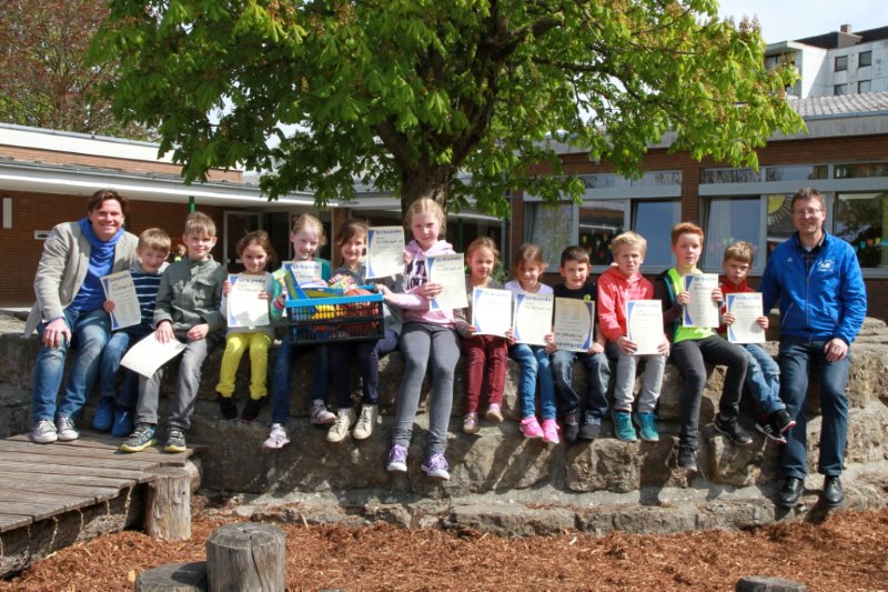 Das Bild zeigt Schulleiter Marc Gitter und Klemens Waldikowski zusammen mit den erfolgreichen Schülerinnen und Schülern der Klassen 1a und 4a nach der Preisübergabe.