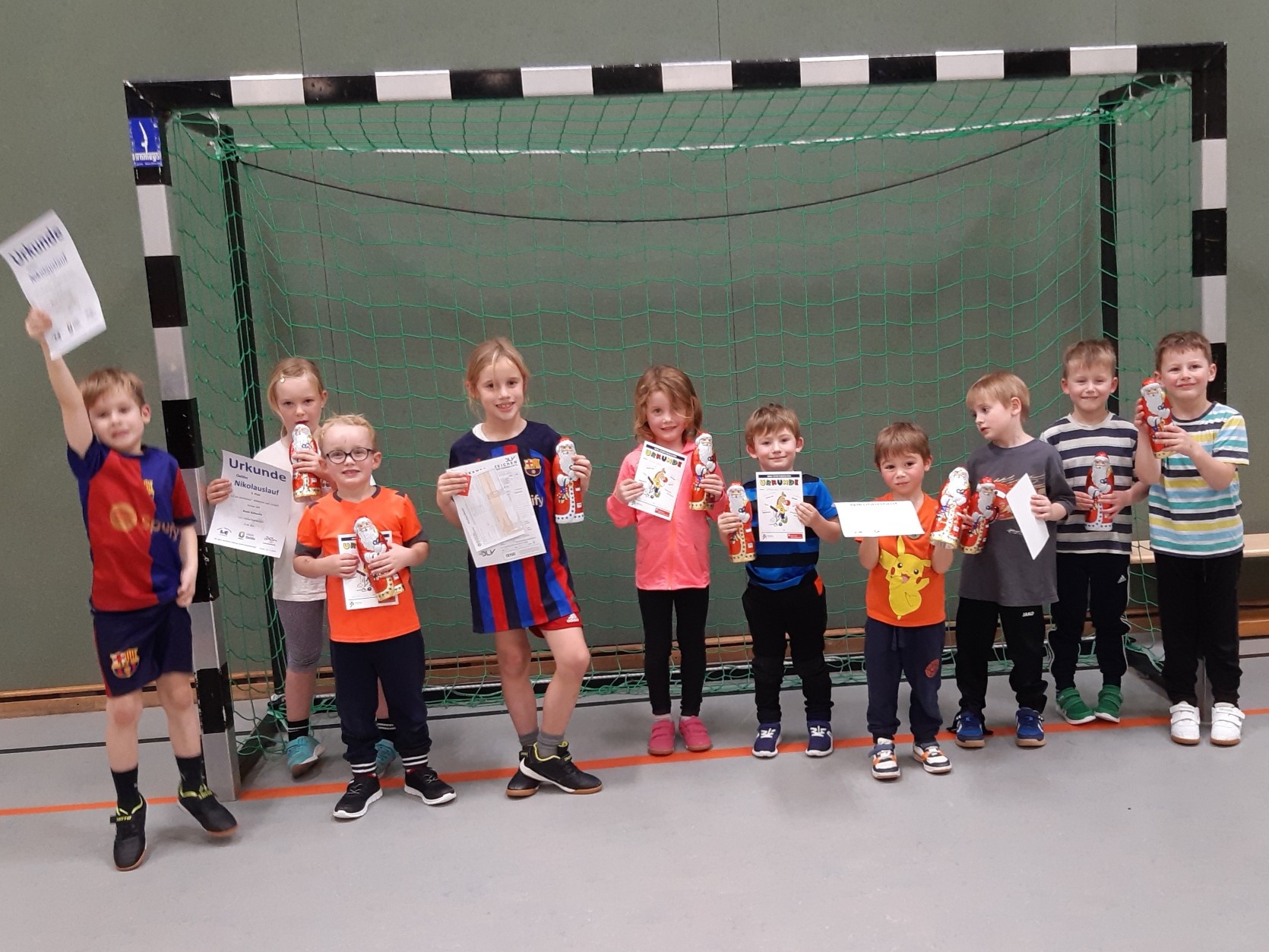 Kurz vor Beginn der Weihnachtsferien hat Elke Horsthemke in ihrer Trainingsgruppe der Kinder U8 Sportabzeichen und Minisportabzeichen verliehen. Zwei Jungen haben die Bedingungen für das goldene Schüler-Sportabzeichen erfüllt. Der siebenjährige Michel Bergmann erreichte außerdem das DLV-Abzeichen mit 507 Punkten. Acht Kinder haben beim Minisportabzeichen gut abgeschnitten. Lediglich eine kleine Gruppe, da die meisten Kinder das Minisportabzeichen in diesem Jahr bereits im Kindergarten erworben haben. Alle Kinder der Gruppe erhielten zum süßen Abschluss einen Schoko-Nikolaus.